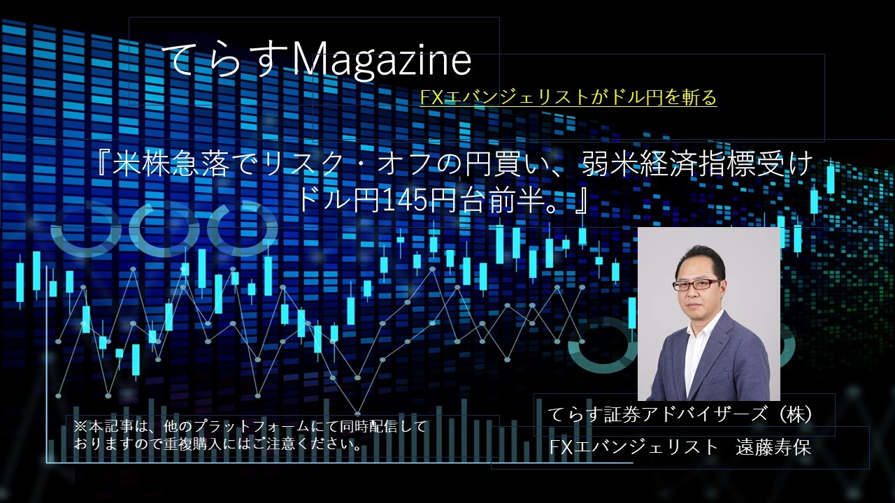 東京時間、ドル円は、日経平均の大幅安を受け、リスク回避の円買いが先行し、昨日安値の145.10円を割り込み一時144.89円まで下落。その後買い戻しが入るが、戻りは鈍かった。欧州時間、時間外の米10年債利回りの低下もあり、ドル円は軟調地合いで145円を挟み小動き。NY時間、7月JOLTS(米雇用動態調査求人件数)が767.3万件と予想810.0万件を下振れ、また前月の数値が下方修正されたことが分かると、FOMCでの大幅利下げ観測が高まり、米10年債利回りが低下し、ドル円は143.70円まで下落。