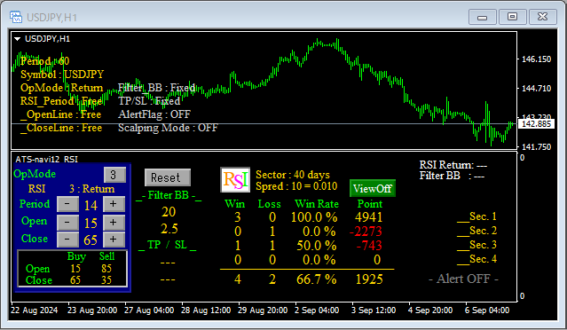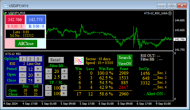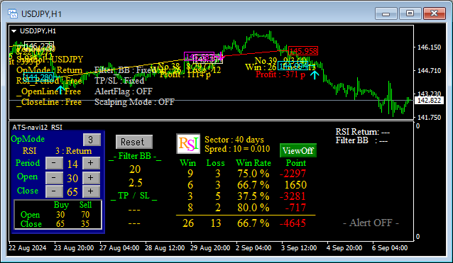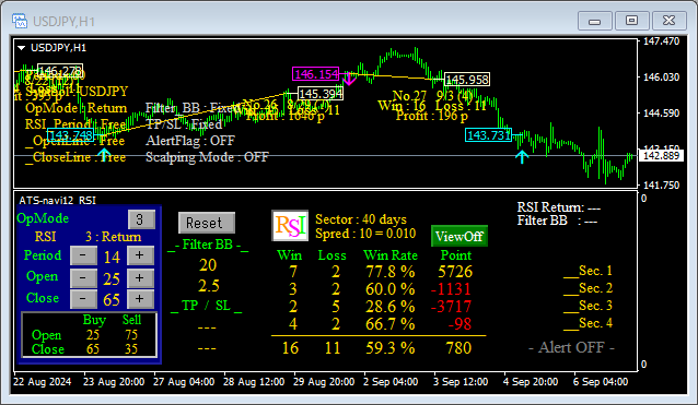 チャート上に取得の基準となる「RSI_OpenLine」と「RSI_CloseLine」の設定値が変更できる[+]、[-]のボタンが表示されると思います。
