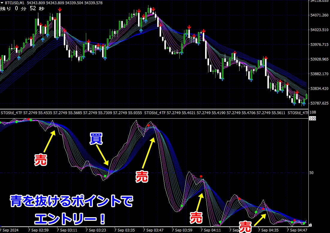 ② 矢印サイン点灯状態で、インジケーターのピンク色の帯が、緑の帯に上から覆いかぶさるような形状であれば、現在のローソク足が確定する数秒前か確定の直後に1分判定または3分判定でローエントリーします。