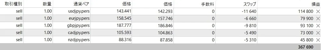 トレード履歴と現在のポジションは以下になります。