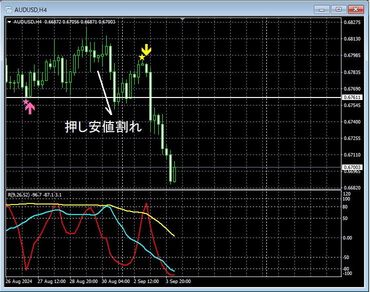 また、この例では、損切りラインを直近高値の少し上に置くことなどによりリスクリワードの良いトレードが可能である。