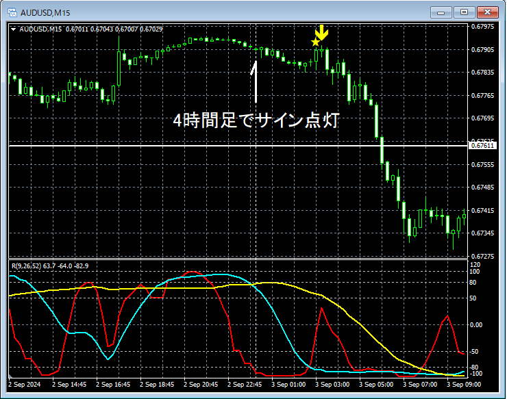 上の15分足を見ると、4時間足でサインが点灯した後、15分足でもmBDSR(フィルター:RCI26とRCI52)の戻り売りサインが点灯してプライスは大きく下げている。
