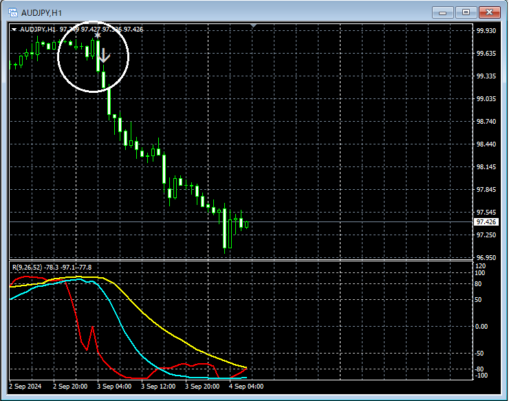 上の1時間足で白い円で囲ったあたりを見ると、下落を示唆する2Bリバーサル(ツーバーリバーサル)が出現している。そして、その直後にR1R2S2の売りサインが点灯して大きく下落している。