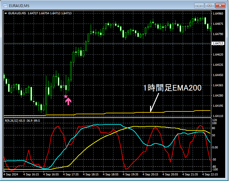 上の5分足を見てみると1時間足EMA200付近で反発気味。その後、mBDSR(RCI2本フィルター)の押し目買いサインが点灯してプライスは大きく上昇している。
