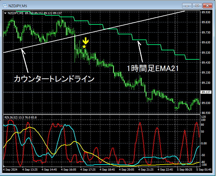 上の5分足を見てみると1時間足EMA21付近から反落。そしてカウンタートレンドライン下抜け後の上昇で、mBDSR(RCI2本フィルター)の戻り売りサインが点灯してプライスは大きく下げている。