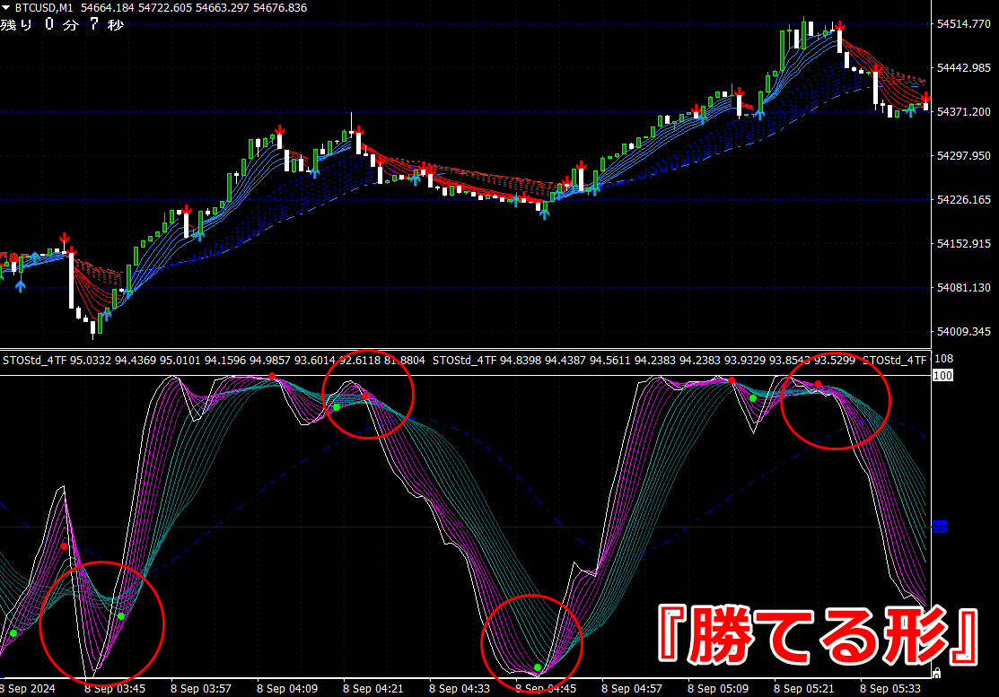 ② 矢印サイン点灯状態で、インジケーターのピンク色の帯が、緑の帯を下からすくい上げるような形状であれば、現在のローソク足が確定する数秒前か確定の直後に1分判定または3分判定でハイエントリーします。