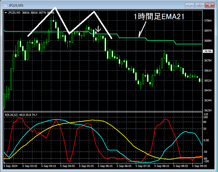 上の5分足では、重要視している1時間足EMA21付近でダブルトップを形成して下げている。そのダブルトップの右肩でR1R2S2の売りサインが点灯した形となっている。