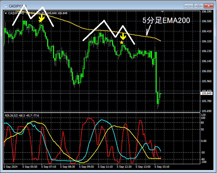 上位足の状況は省略。上の5分足では、重要視している5分足EMA200付近まで上昇した局面でダブルトップを形成して下げる場面が2回あるが、その2回ともダブルトップの右側の山における下げ開始のタイミングをmBDSR(RCI2本フィルター)の戻り売りサインが上手くとらえていることが分かる。