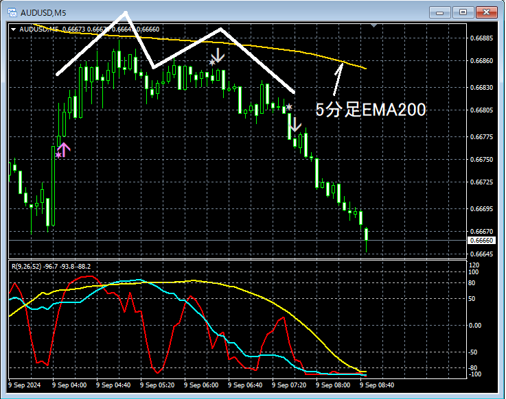上の5分足では、5分足EMA200付近まで上昇してきたところでR1R2S2の戻り売りサインが点灯してプライスはしっかりと下げている。結果として、ダブルトップの右側の山で戻り売りのサインが発生した形となっている。