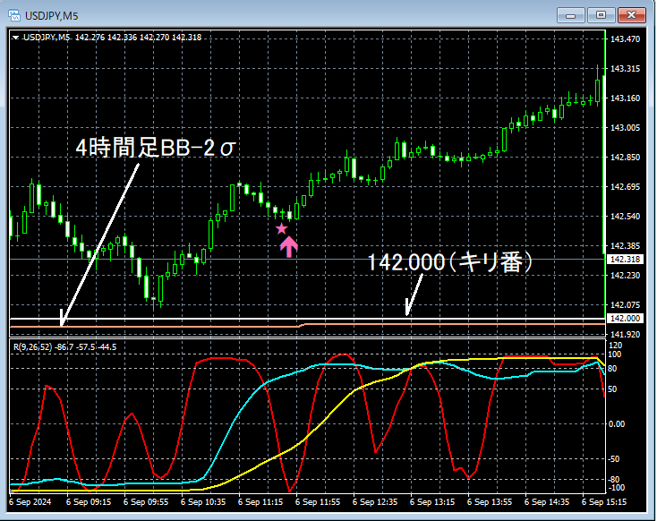上位足の状況は省略。上の5分足では、心理的節目となる場合もあるキリ番(このケースでは、142.000)と4時間足ボリンジャーバンド(-2σ)が重なっているあたりまで下落したところで反発気味。そしてmBDSR(RCI2本フィルター)の押し目買いサインが点灯し、その後、プライスはしっかり上昇している。