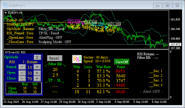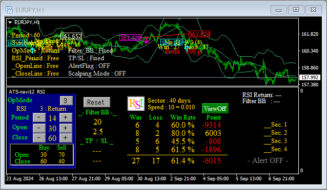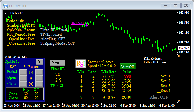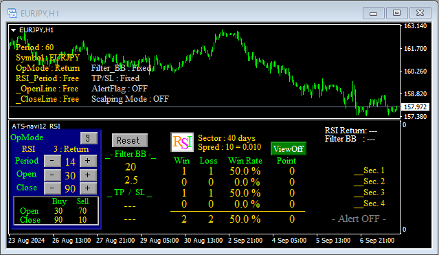 チャート上に取得の基準となる「RSI_OpenLine」と「RSI_CloseLine」の設定値が変更できる[+]、[-]のボタンが表示されると思います。