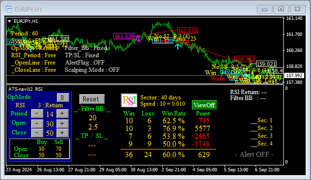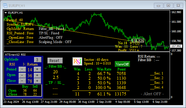 どのタイミングで決済するかもとても重要です。 決済の基準となる「RSI」の設定ラインについて変化させてみましょう!