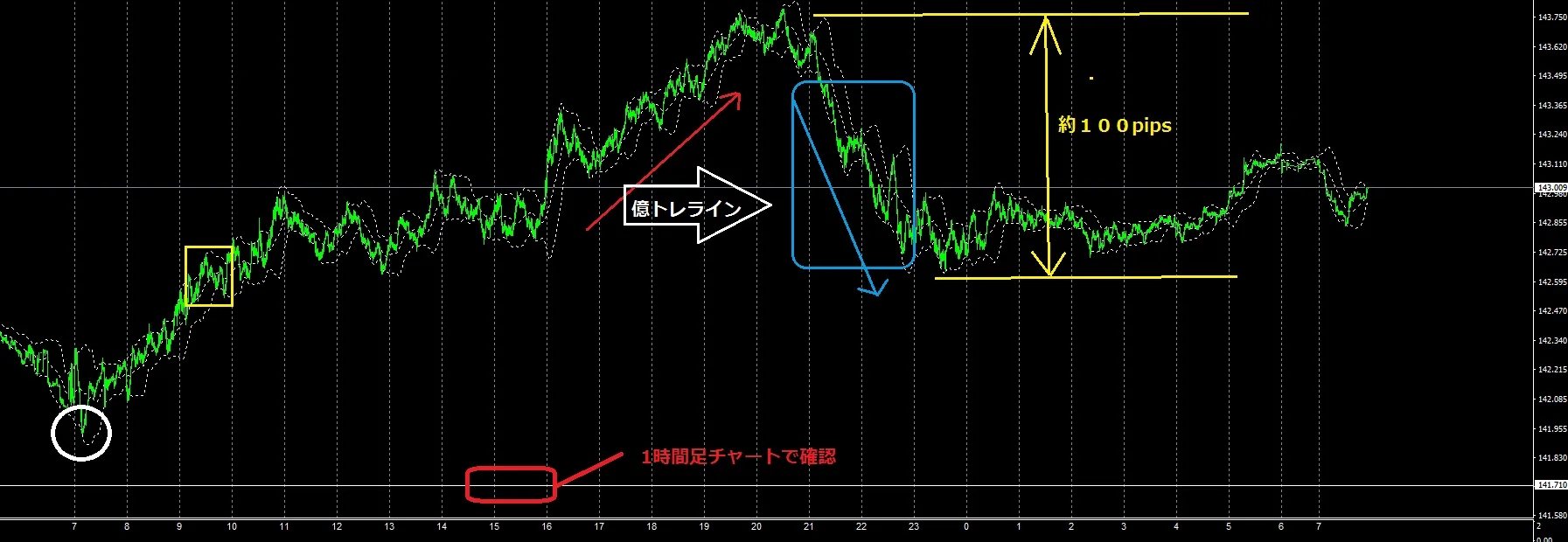 先ず、最初の高安値を確認し、8時からの上昇を億トレラインでショート狙いするのか、昨日高値を目指す展開になるのか、売り買い切り替わりと億トレラインで判断して行く事になります。