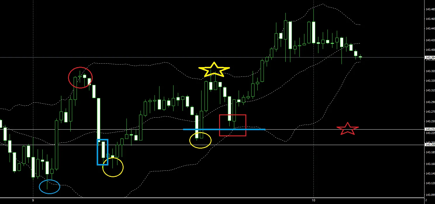 勿論ここを抜ける事もありますが、その時は左横黄色〇割れ撤退ですから、悩む事はありませんし、損切マージンを稼げる距離です。
