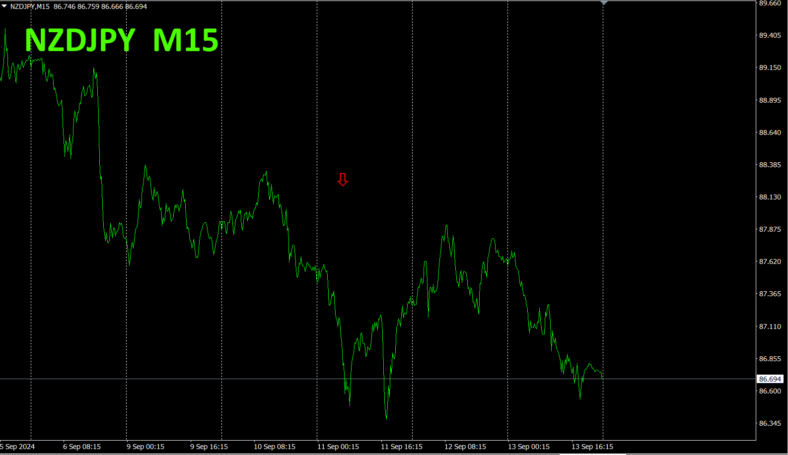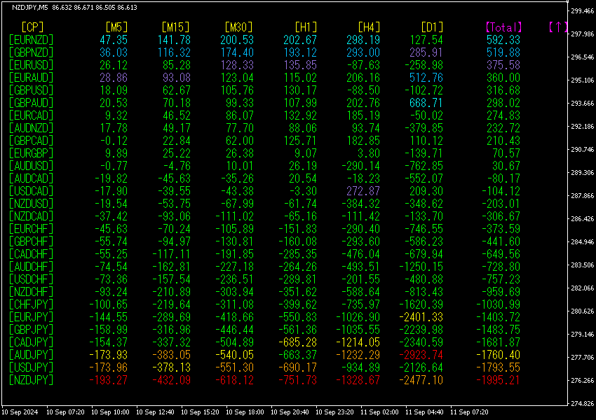 [Total]数値の降順に並んでいます。一番下の行にあるNZDJPYは、全ての時間足で赤色系の表示色になっています。しかもTotal数値が-1995.21と大きなマイナスの数字になっています。NZDJPYに下降トレンドが発生していることを示しています。