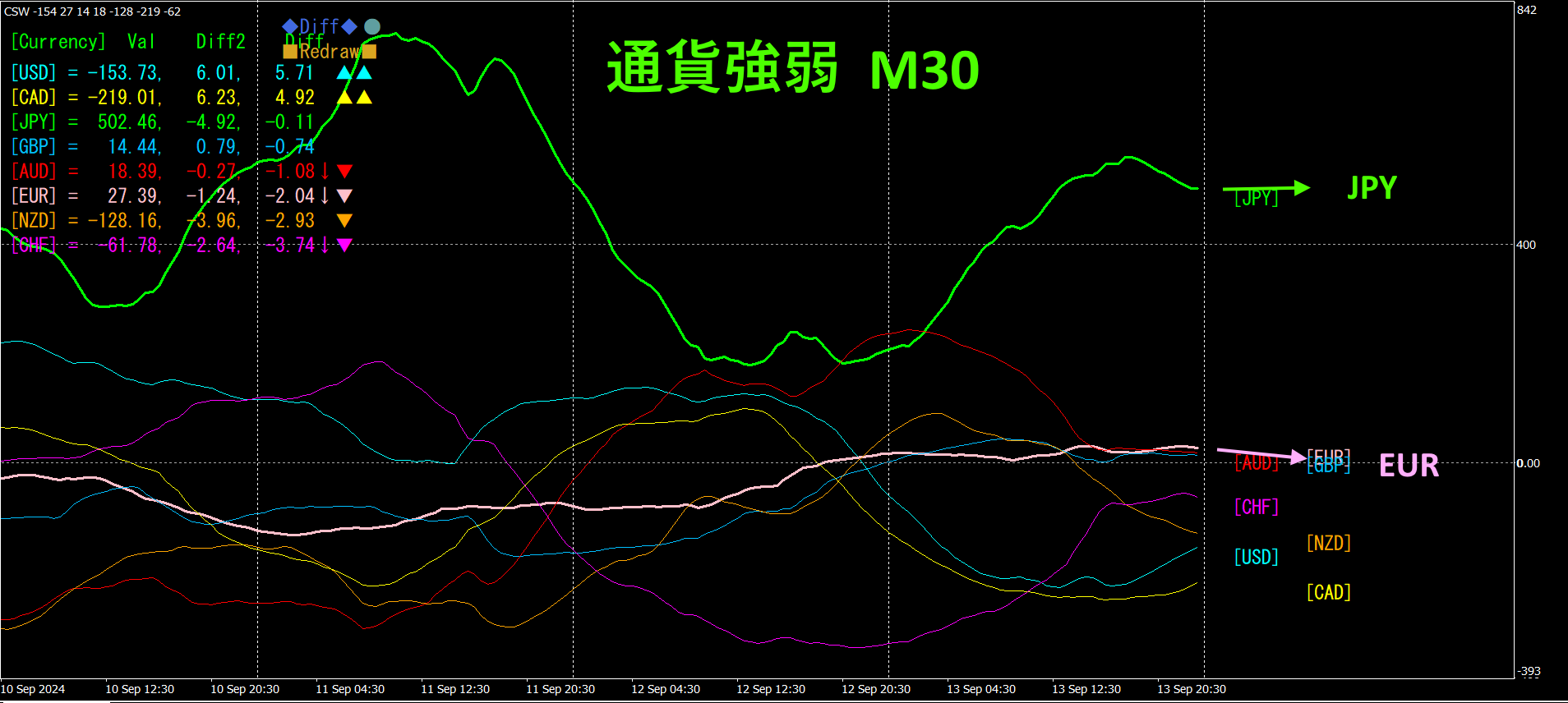 ピンク色がEUR、緑色がJPYです。EURは水平からやや下向き、JPYは、ほぼ水平になっていて、はっきりした方向感が出ていません。今後のEURJPYは、レンジ状態で推移すると考えられます。