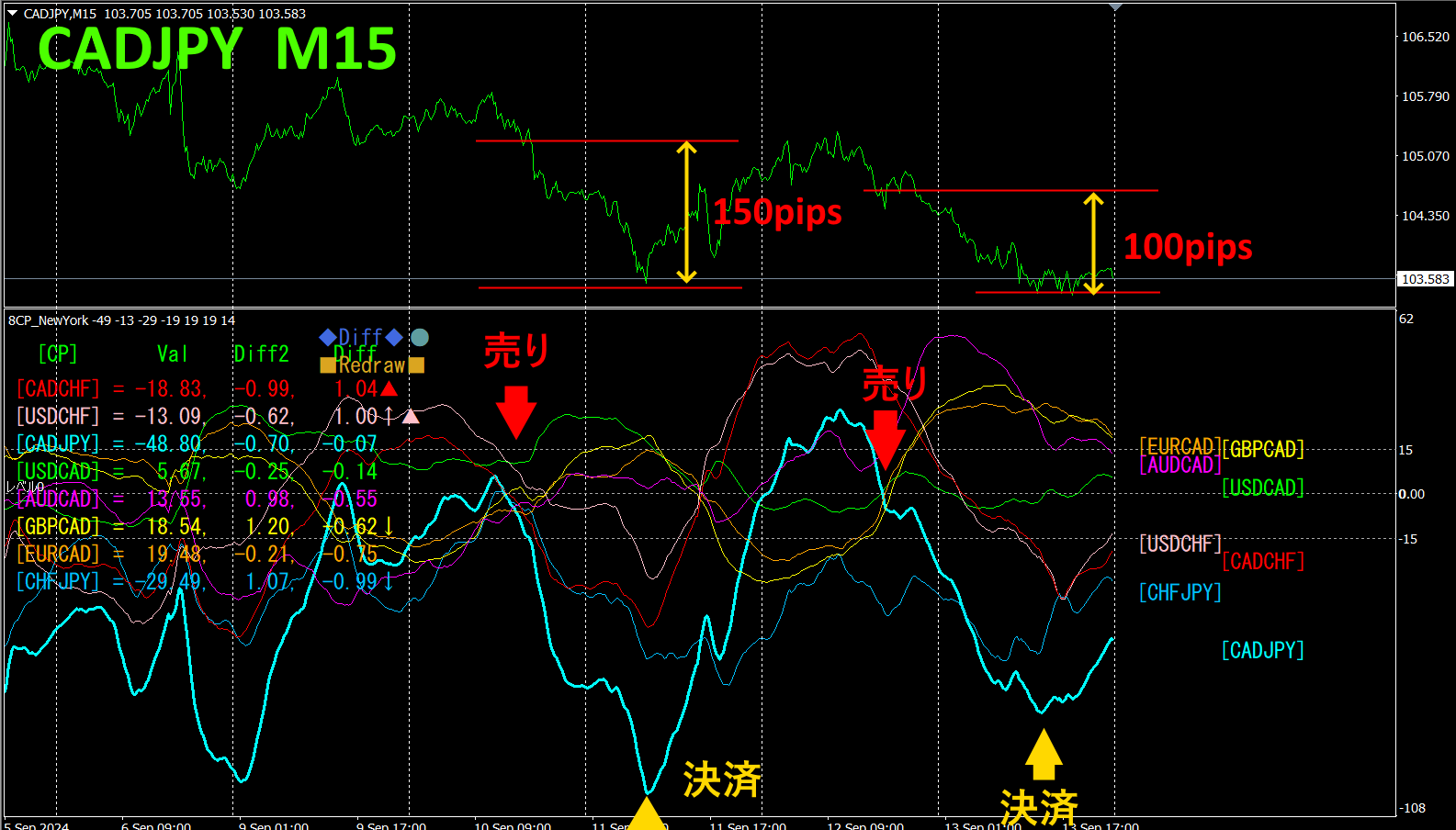 上半分は、CADJPYの15分足チャートです。下半分は、「8CP見える化インジケータ」によるものです、水色太線のグラフがCADJPYに相当します。