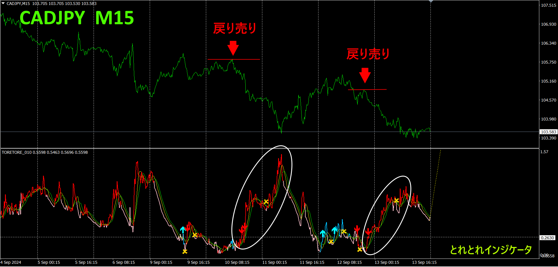下半分が「とれとれインジケータ」です。CADJPYの15分足チャートは、右肩下がりの下降トレンドになっています。「とれとれインジケータ」でも、色の基調が赤色主体になっていて、メイン線に青色が殆ど出現していません。「とれとれインジケータ」で、メイン線がゼロライン近くまで下がってくるのを待って、反転を確認してから売りエントリーをすれば良いだけです。白色の楕円に囲った所が、絶好の戻り売りの「とれとれ」ポイントになっているのが良く分かります。この2点以外は、トレードをしないで、取れる所だけに注目してトレードすることが、このインジケータを活用する肝になります。