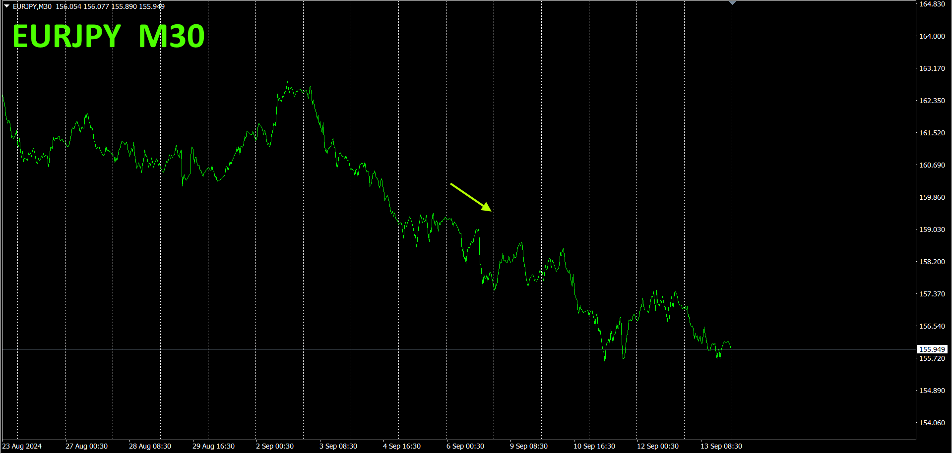 EURはほぼ水平、一方JPYは、力強く上を向いています。結果として、今後のEURJPYは、さらに下落するものと考えられます。