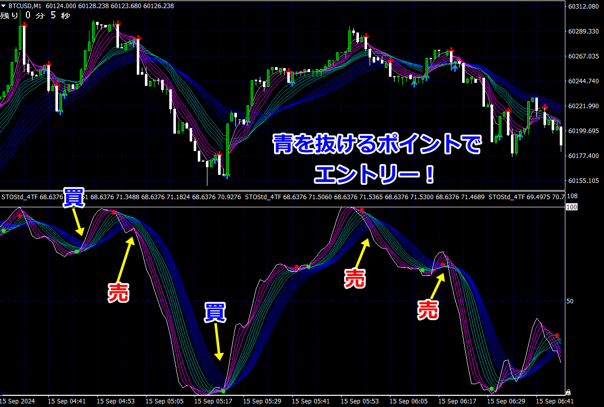 インジケーターの帯はピンク・緑・青の3層構造で、3層の帯は、収斂と拡散を繰り返しますので、 上昇時は、上から ピンク・緑・青 の並びとなり、下落時は、その逆で、上から青・緑・ピンクの並びになります。