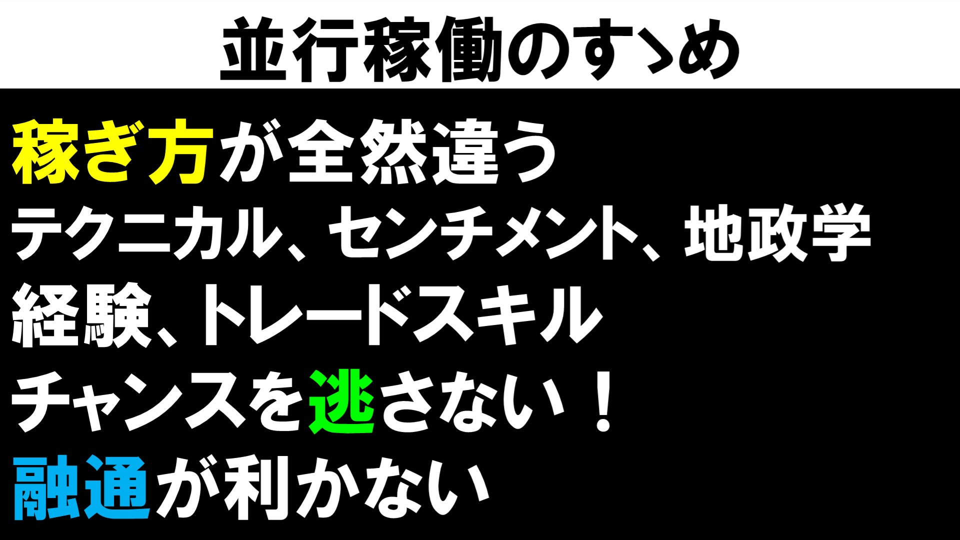 では何故、裁量と自動売買を並行させることがリスク分散に繋がるのか?それはもちろん稼ぎ方が全然違うからですよね。何から何まで違う。