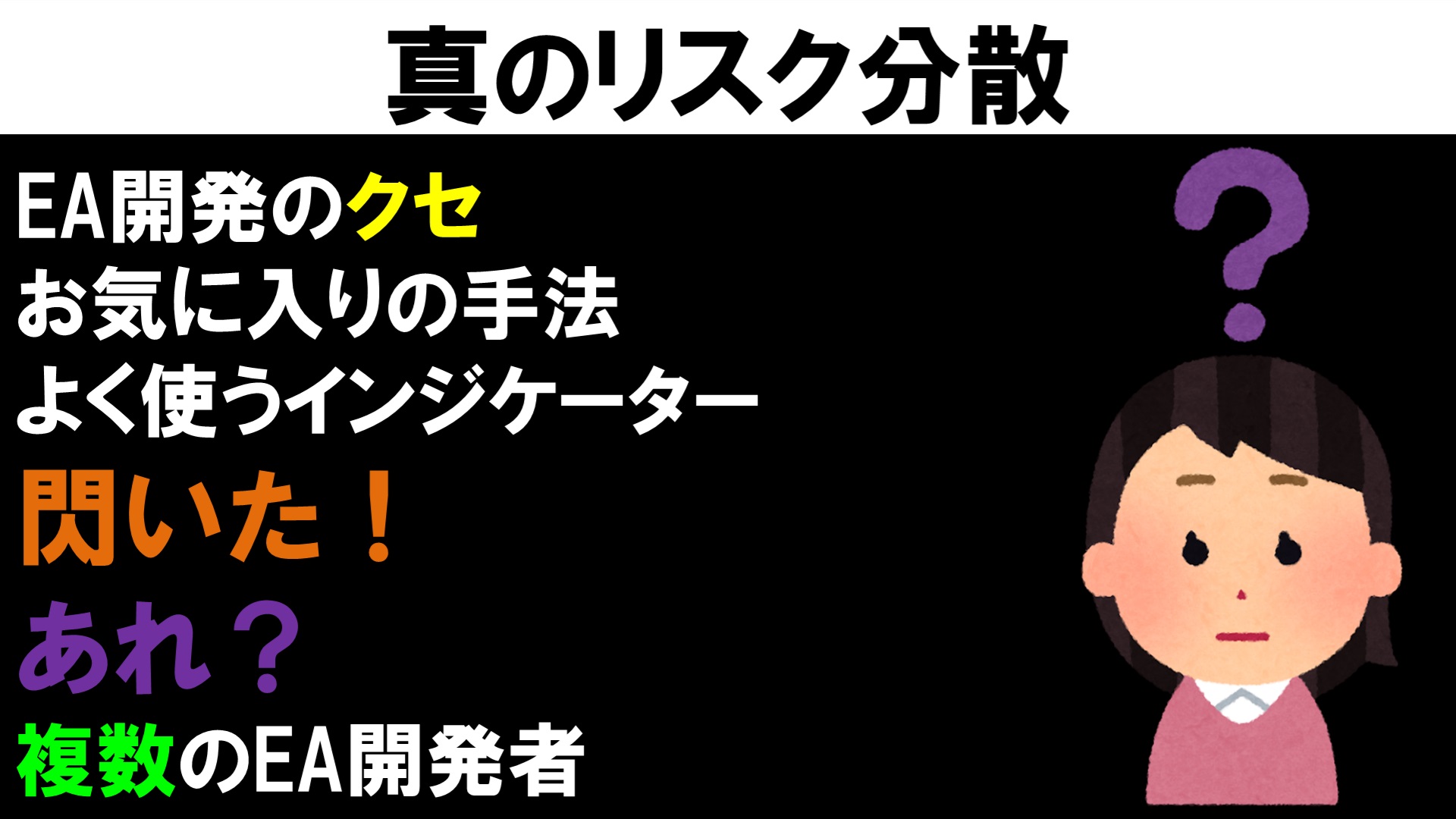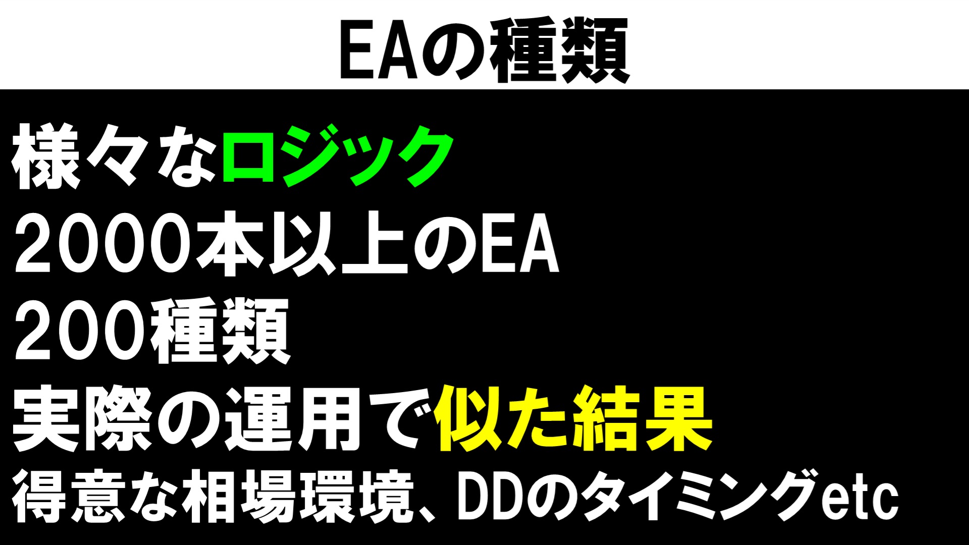 そしてこの記事はEA講座なのでEAに関してのリスク分散についてもお話しなければなりませんね。EAにはご存知の通り様々なロジックが存在します。それこそ星の数ほどあります。