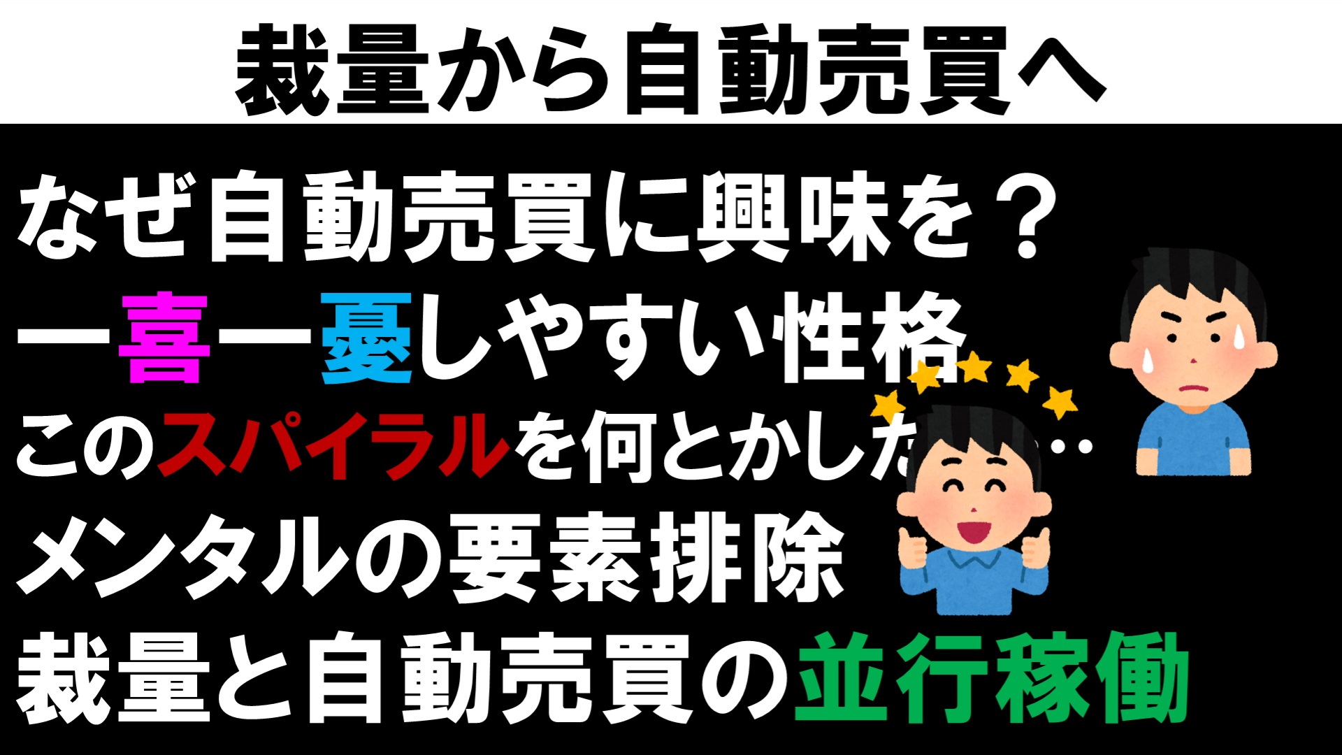 若しくは私のようにリスク分散目的で裁量をやりつつ自動売買も並行して稼働させるということを研究されてる方もいらっしゃるかと思います。