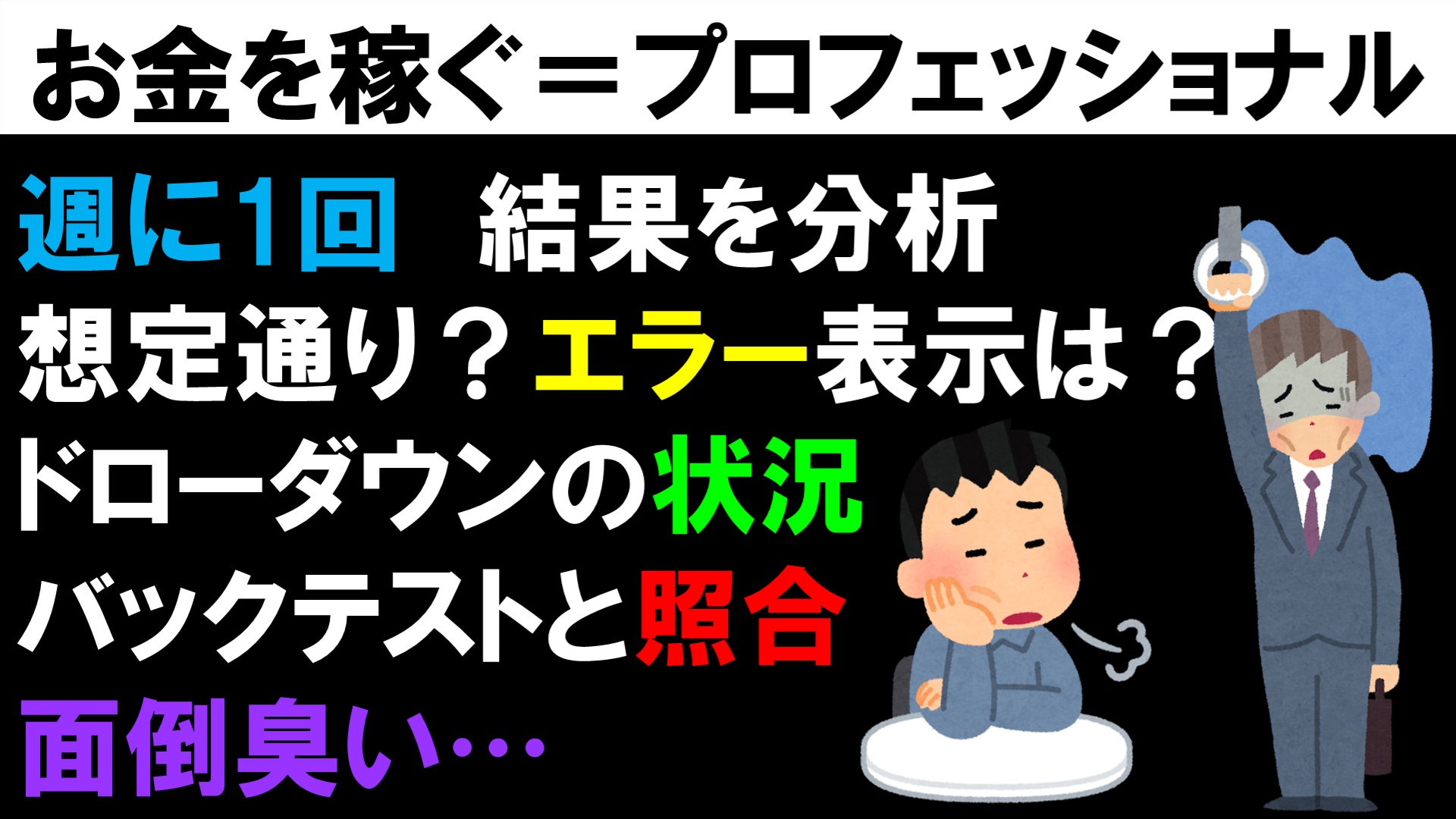 普段は放置でいいんですが、少なくとも週に1度は、例えば週末などに結果を自分の目で分析する必要があります。想定通りの稼ぎ方をしているか?エラーは表示されてないか?ドローダウンしているとしたら、それは想定内か?バックテストと照らし合わせておかしなところは無いか?等々…
