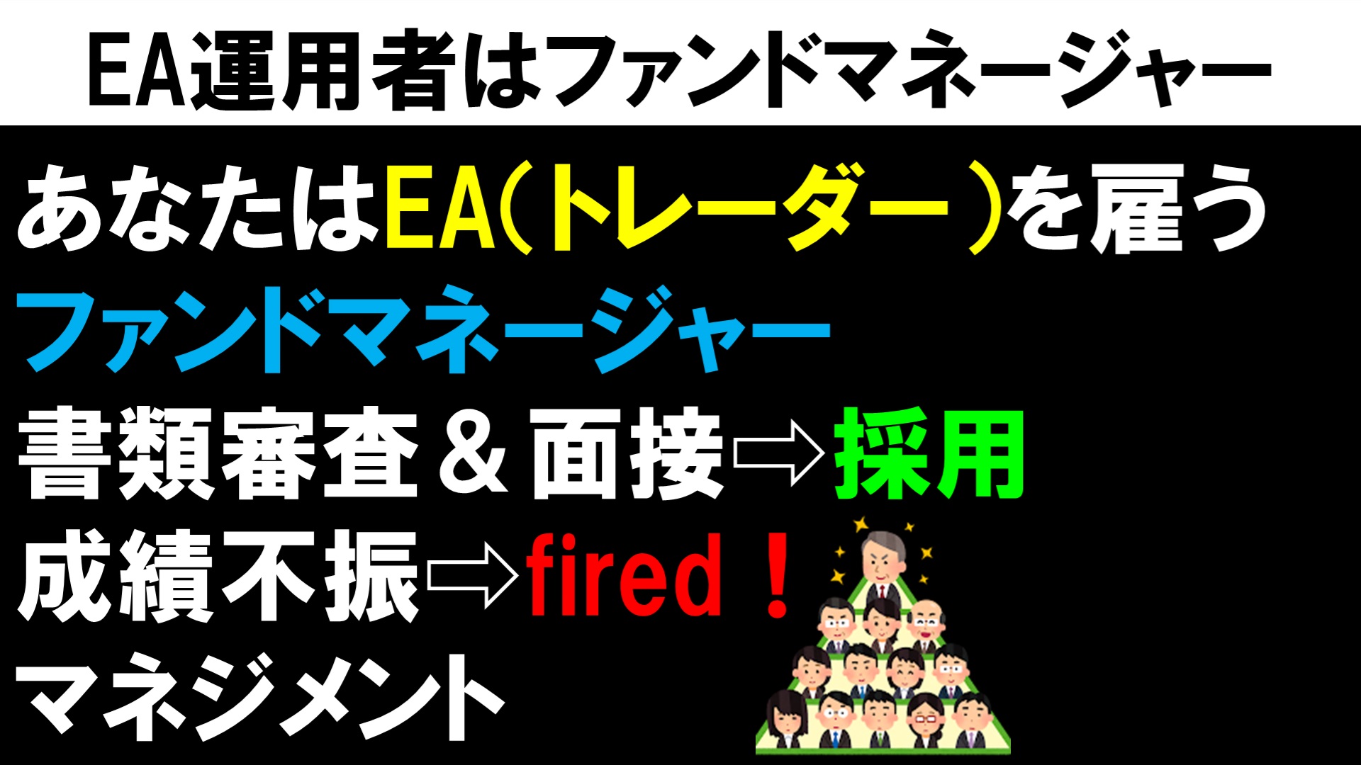 EA運用者はいわゆるファンドマネージャーと同じです。みなさんはEAというトレーダーと面接をし、雇うかどうか決め、実際に雇ってみて、成績が悪かったらクビにして他のEA(トレーダー)と入れ替えて…