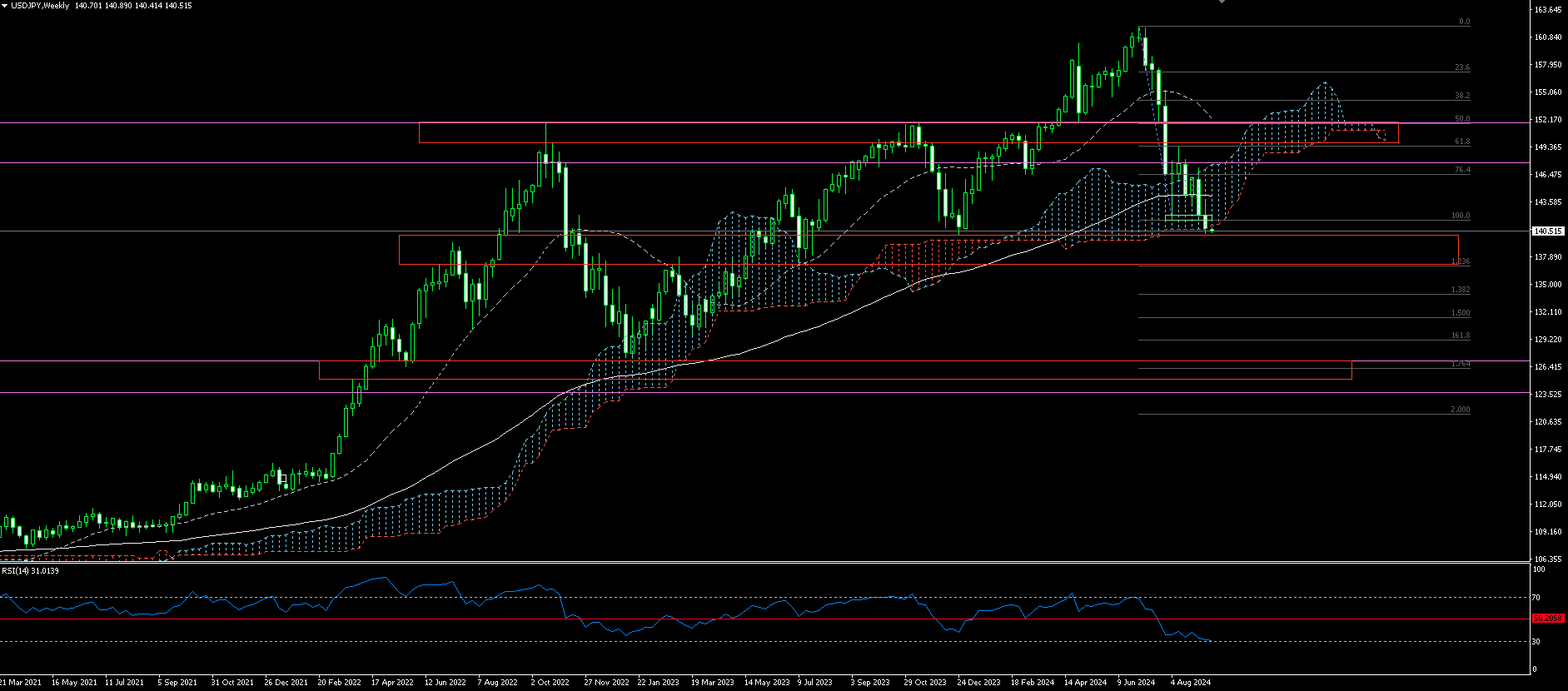 - 週足見ると持ち合い下抜けたことや月足、週足ゾーンからの反発が弱いことからかなり下落優位な波形に見える
