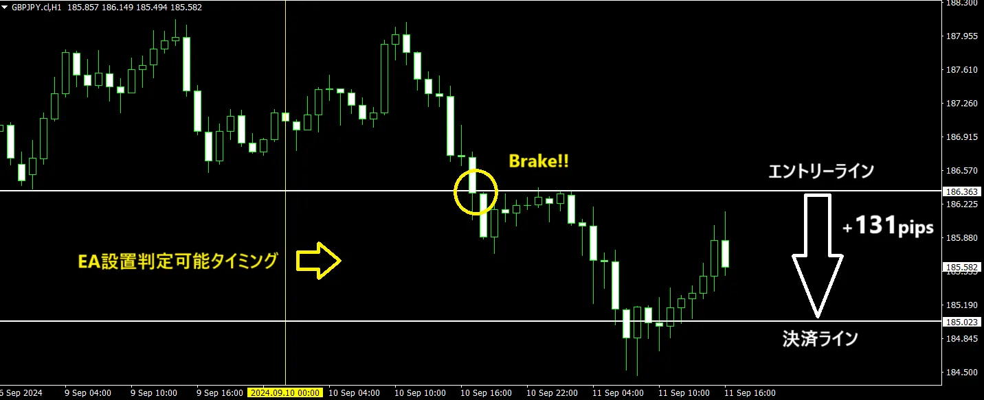 ②GBP/JPYにおいては手法に基づきEA設置判定が可能になったのが9/10の0:00(日本時間 朝6:00) 。