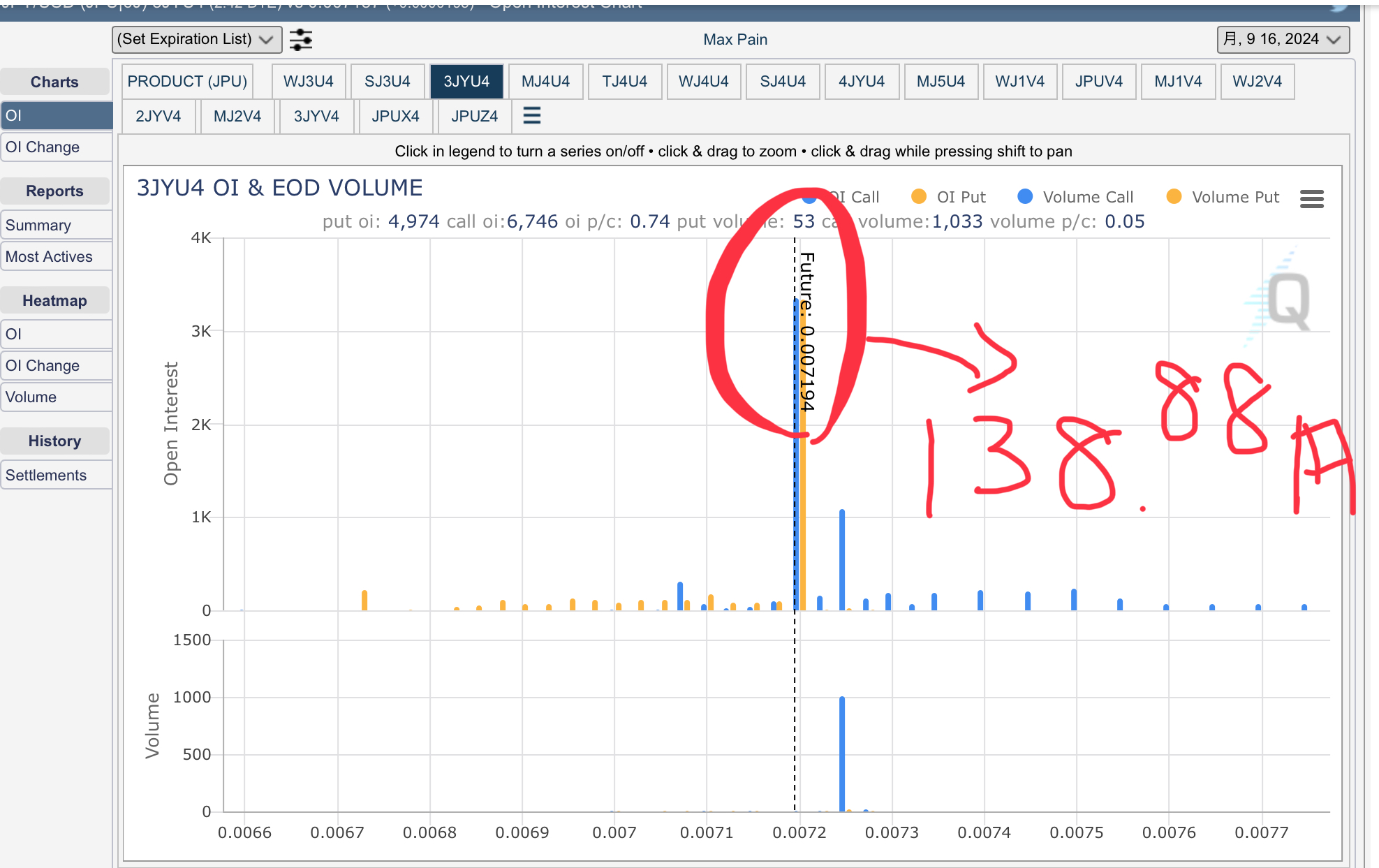 オプションが設定されていた142円(オレンジのライン)に到達しさらに、上に出現していた18日期日の142.50円の大きなオプションにタッチして下落しましたね。おりしも、朝食中であり北朝鮮のミサイルらしきニュースも流れたため売りを仕掛けました。早起きは三文の徳ですね。本日はFOMCがありますので基本的にはやらない方が良い日です。とはいえある程度発表内容とそれに対する値動きが高い確率で予想できる場合には13の武器の1つ「イベントトリガー戦術」を使えます。イベントまで起きている必要がありますので万人向けではありませんし、毎回イベント時にトレードする癖がつかないようにしましょう。あくまでも高確率で予想できる場合のみです。先物は138.88円まで下落しており、オプションも収束しています。ボラティリティも低下していることから、FOMCを前にしてこの場所に強く収束し尽くしたことを示しています。