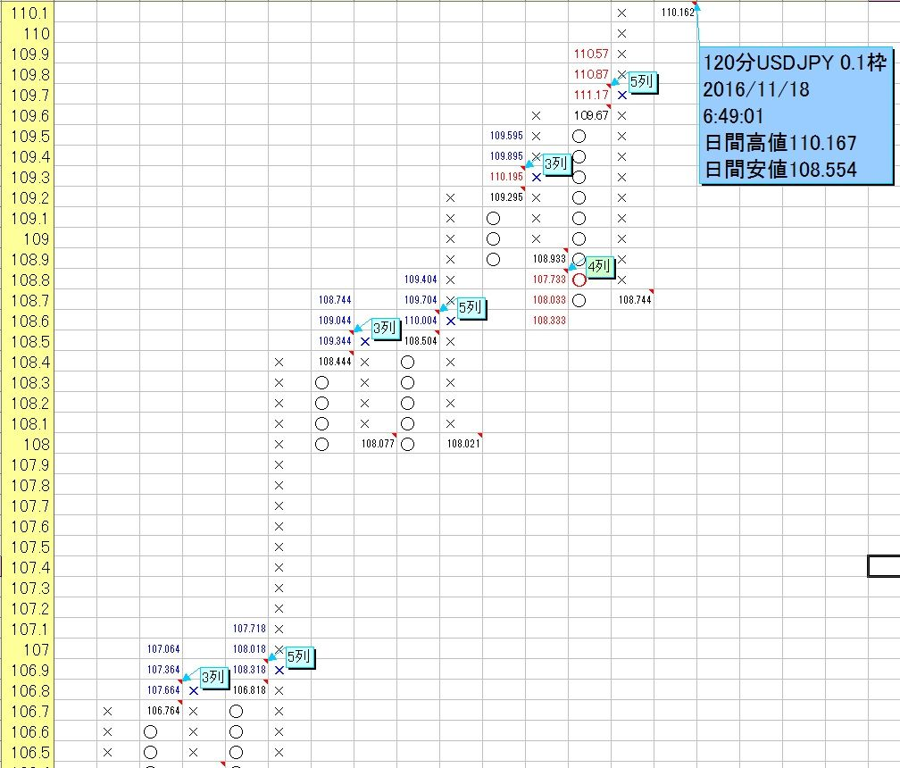 A. ↓の「120分足USDJPY0.1円枠P&F」を例にご説明します。