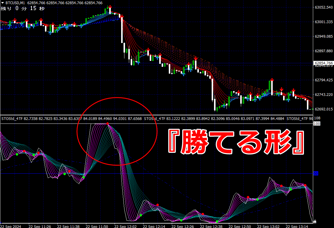 ② 矢印サイン点灯状態で、インジケーターのピンク色の帯が、緑の帯を下からすくい上げるような形状であれば、現在のローソク足が確定する数秒前か確定の直後に1分判定または3分判定でハイエントリーします。