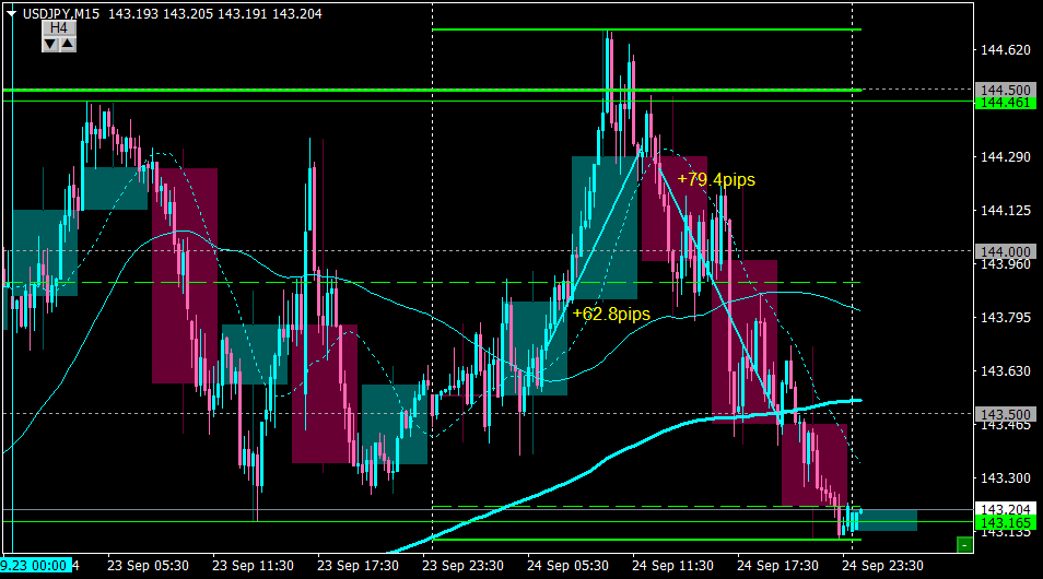 その後の天井試しからショートし、5本目のH4の足のクローズでイグジット。+79.4pips