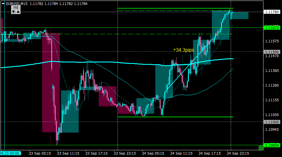 昨日は、朝の戦略通り1.110での短期ダウの上昇転換を確認後、前日の戻り売りの崩れ狙いでロング。+34.3pips