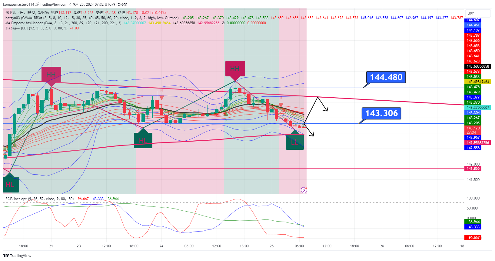 フィボ38.2が142.761付近ここまで来て一旦の反発を想定しますが