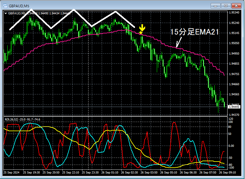 上位足の状況は省略。上の5分足では、トリプルトップを形成して反落。サポートとして機能していた15分足EMA21を割り込んだ後、その移動平均線付近まで上昇したところでmBDSR(RCI2本フィルター)の戻り売りサインが点灯し、その直後からプライスはしっかり下げている。