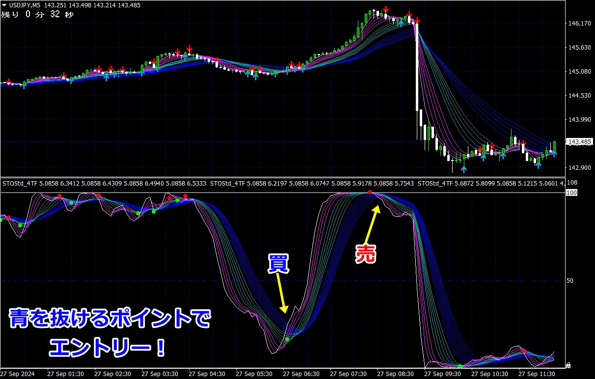 ※ サイン点灯=エントリーではありませんので、インジケーターが緑帯をすくい上げるような形状でない場合は、エントリーしません(サイン点灯でエントリーできる頻度は、数回に1度くらいです)。