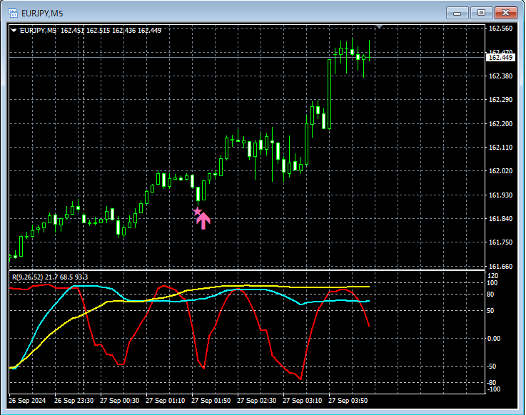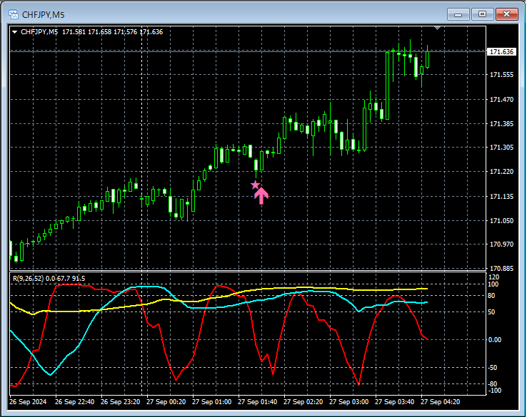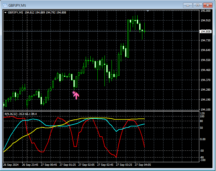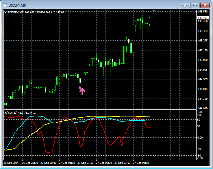 上の5分足では、ドル円及び各クロス円ともにmBDSR(RCI2本フィルター)の押し目買いサインが点灯してしっかりと上昇している。