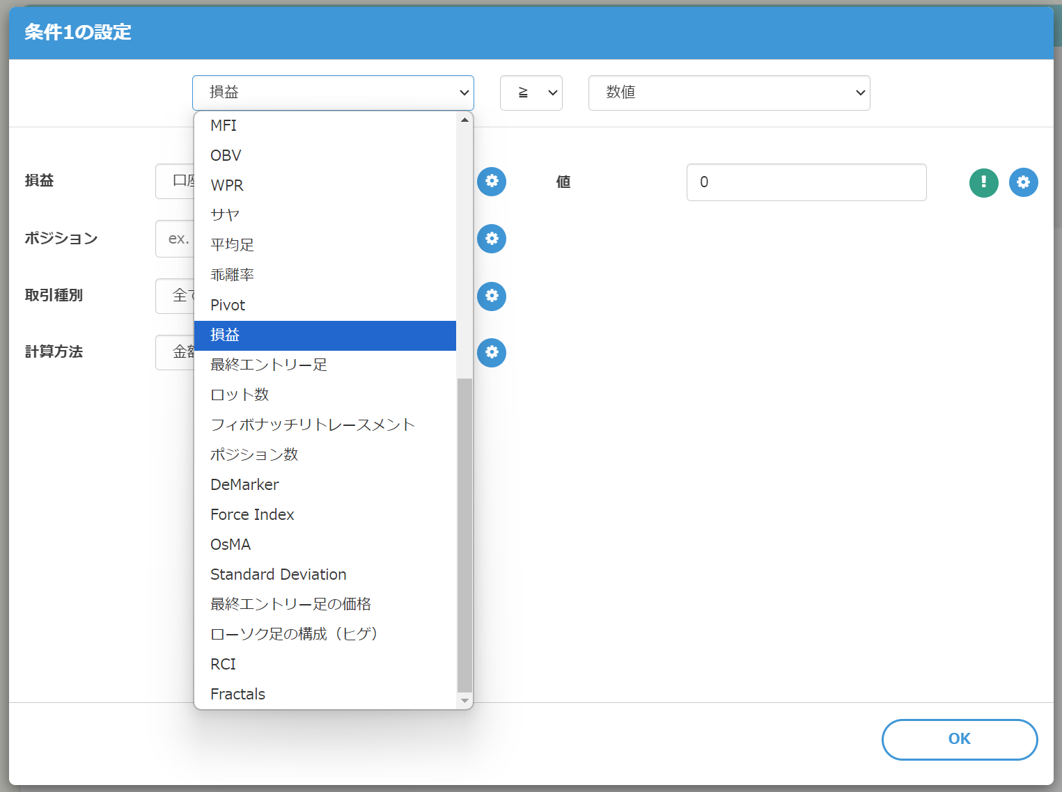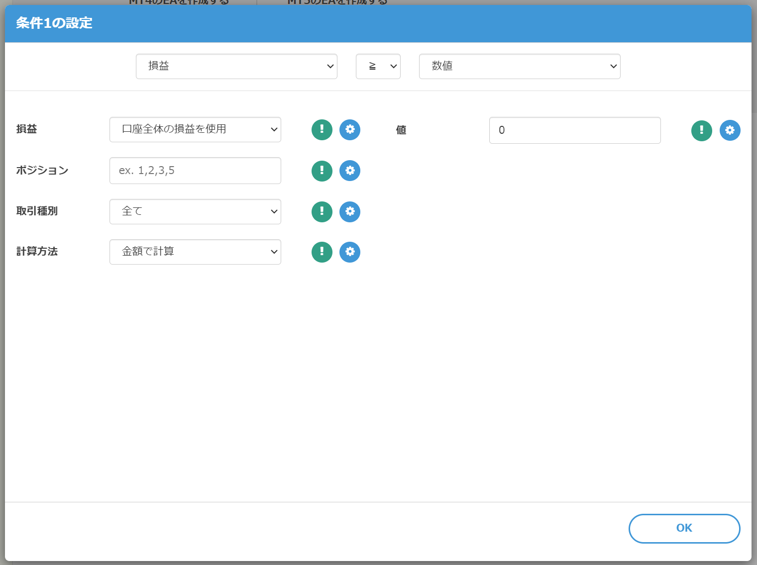 }指定した利益で決済するように、決済分「if(getOrderProfit("0", 0, true) >= Number_value_1_1_2) signal = 1;」を用意されている「take_profit」で決済されるように変更。