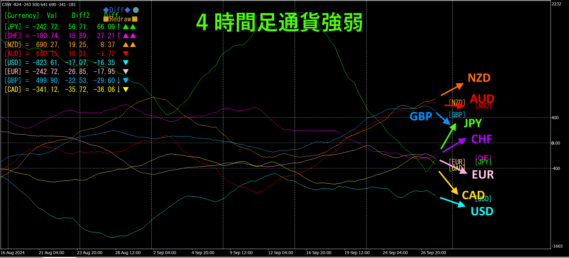 4時間足では、JPY、CHF、NZDが上向きです。一方、CAD、GBP、EUR、USD、AUDが下を向いています。