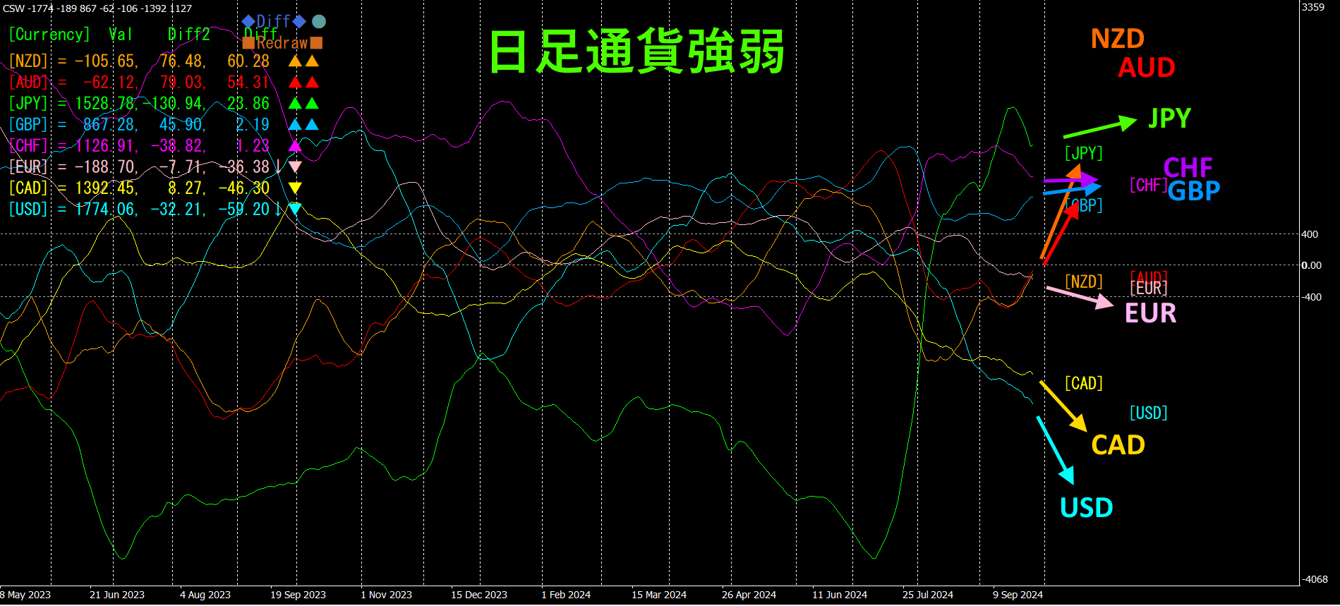 NZD、AUD、JPY、GBPが上向きです。一方、USD、CAD、EURが下向きになっています。日足通貨強弱チャートではNZDの上昇とUSDの下降が目立っています。