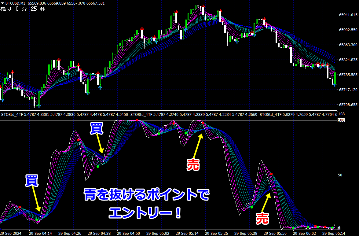 インジケーターの帯はピンク・緑・青の3層構造で、3層の帯は、収斂と拡散を繰り返しますので、 上昇時は、上から ピンク・緑・青 の並びとなり、下落時は、その逆で、上から青・緑・ピンクの並びになります。