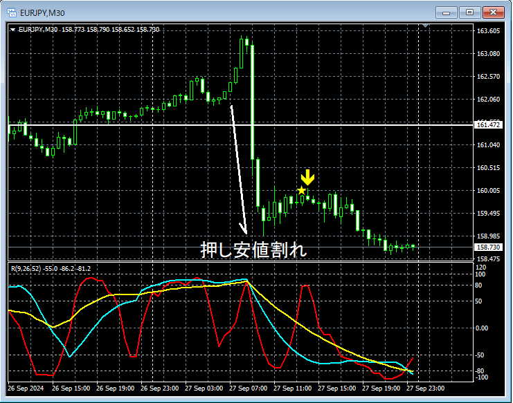 上位足の状況については省略。また、RCIを使った上位足から下位足への落とし込みについては付属のPDFで詳しく説明しているので、それについてもここでは省略。適当に30分足を見ているわけではない。