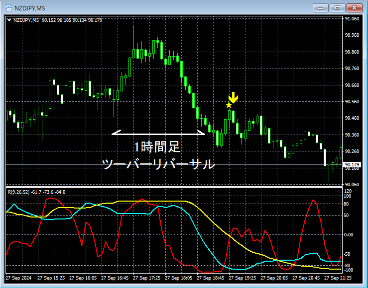 上の5分足では、1時間足で2Bリバーサル(ツーバーリバーサル)の出現に伴い下げた後の上昇でmBDSR(RCI2本フィルター)の戻り売りサインが点灯してプライスはしっかりと下げている。