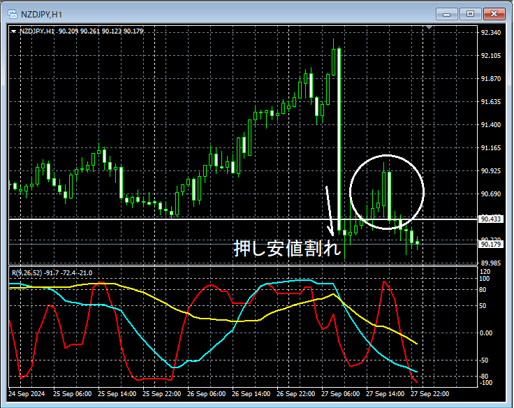 上の1時間足で白い円で囲ったあたりを見ると、押し安値割れの後の上昇で下落を示唆する2Bリバーサル(ツーバーリバーサル)が出現している(白い円で囲ったあたり)。従って、下位足で戻り売りを考えてもおかしくない場面かもしれない。下位足で下げの兆候がないか慎重に見てみることにする。