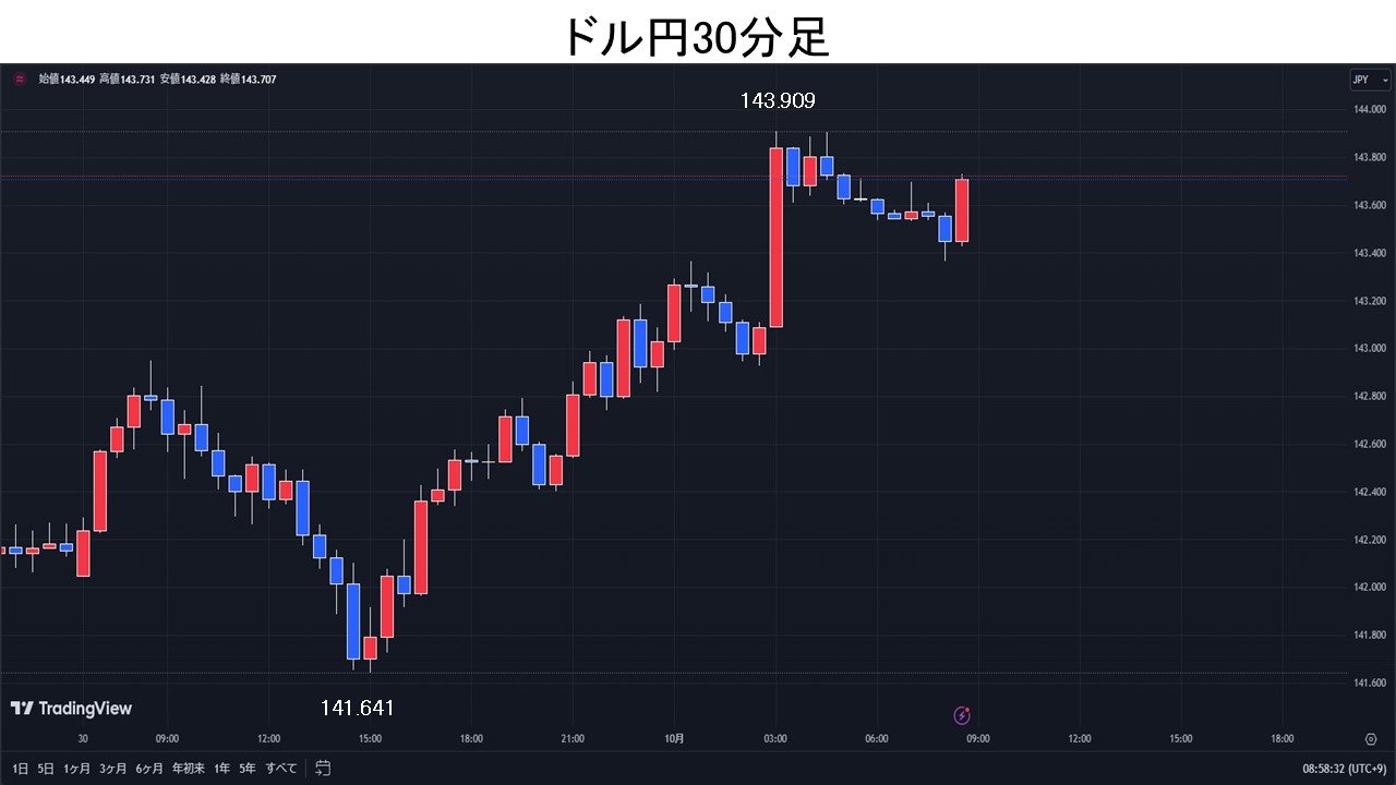 東京時間、石破ショック(金融所得課税強化などを述べていた石破氏が自民党総裁になった事)による日経平均暴落を受け、ドル円は一時141.64円まで下落。欧州時間、ドル円は142円台後半まで買戻しが先行。NY時間、9月米シカゴ購買部協会景気指数が予想上振れ・月末・期末におけるフィキシングでのドル買い観測などで、ドル円は143円台を回復。パウエルFRB議長が「GDP(国内総生産)の下振れリスクはGDI(国内総所得)の修正によるものだが、GDIは上方修正された」と発言すると、市場はタカ派発言との思惑が先行し、ドル円は143.90円まで上昇。