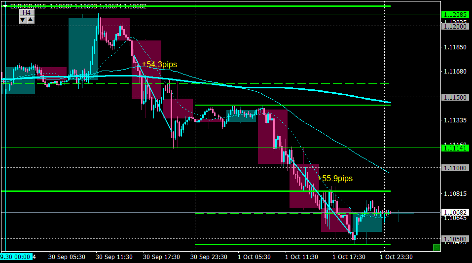昨日はネックラインや前日安値を下方ブレイクしたのでショートエントリー。5本目のH4の足のクローズでイグジット。+55.9pips