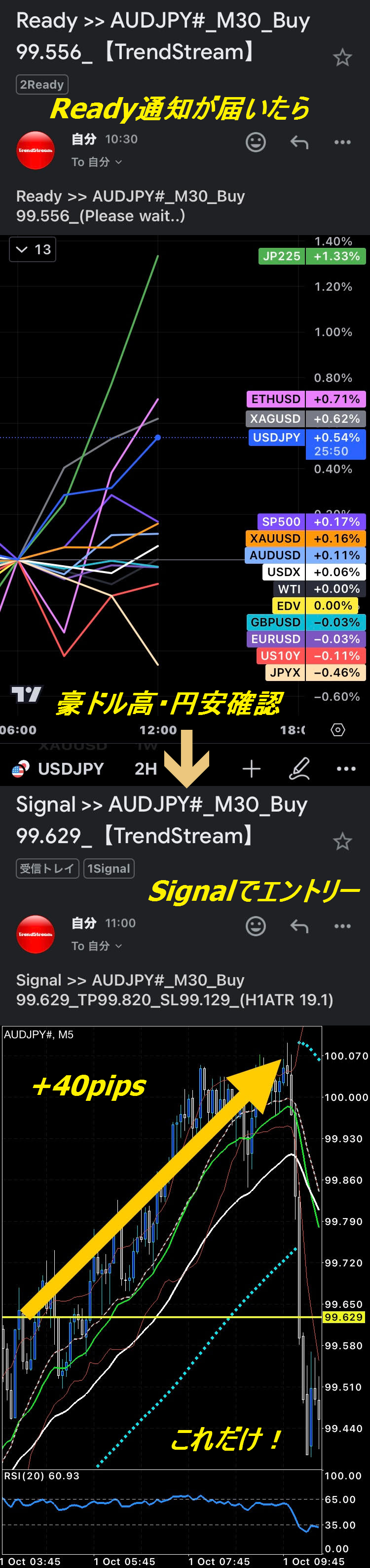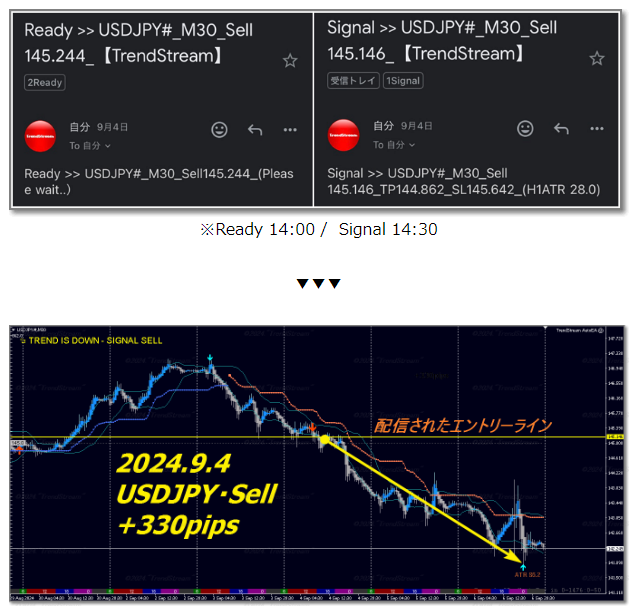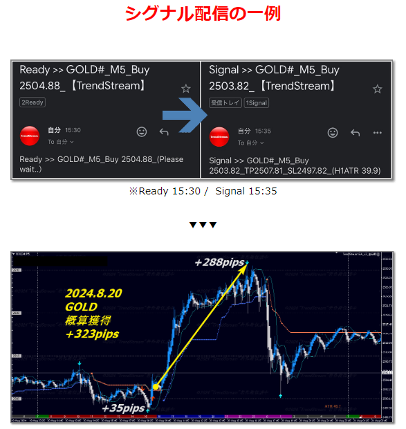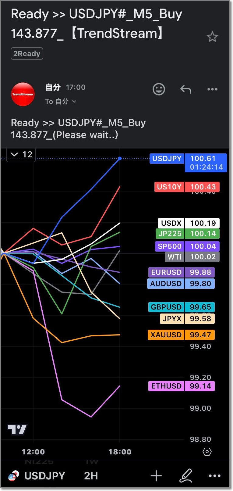 その点、”TrendStream”ではエントリータイミング前になると、事前に準備メールが通知されますので、ずっとパソコンモニターの前にいる必要はなくスマホ一つでもトレードが完結できるようになっていくという最大のメリットを享受できます。